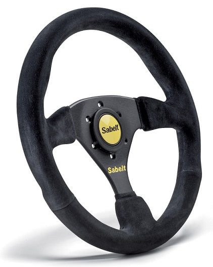 The SW-633 from Sabelt is a 330mm diameter steering wheel designed for motorsport use. It has a flat design with an oval grip trimmed in Italian black suede leather for excellent comfort and grip. The 6 bolt hole pattern is compatible with most popular boss kits including those made by - Momo, OMP & Sparco as well as most quick release bosses.
